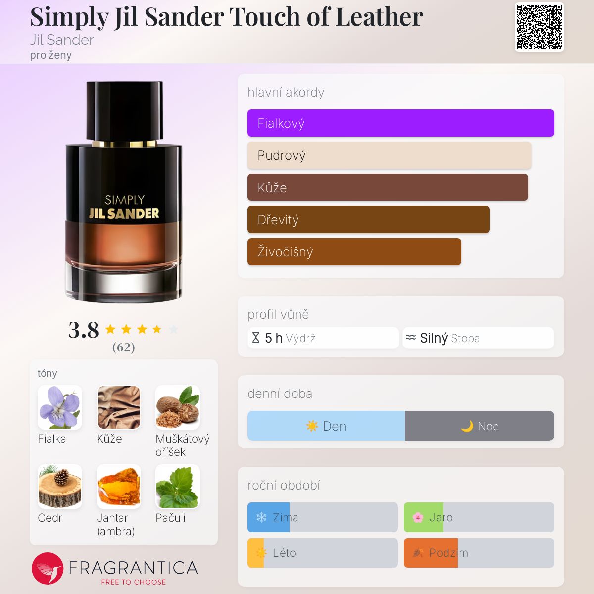 Simply Jil Sander Touch of Leather podle Jil Sander je Chypre Floral vůně pro ženy. Simply Jil Sander Touch of Leather byl/a uveden/a v roce 2016. Vrchní tóny jsou Bergamot a Mandarinka; střední tóny jsouFialka, Muškátový oříšek a Cedr ; základní tóny jsou Kůže, Jantar (ambra) a Pačuli.