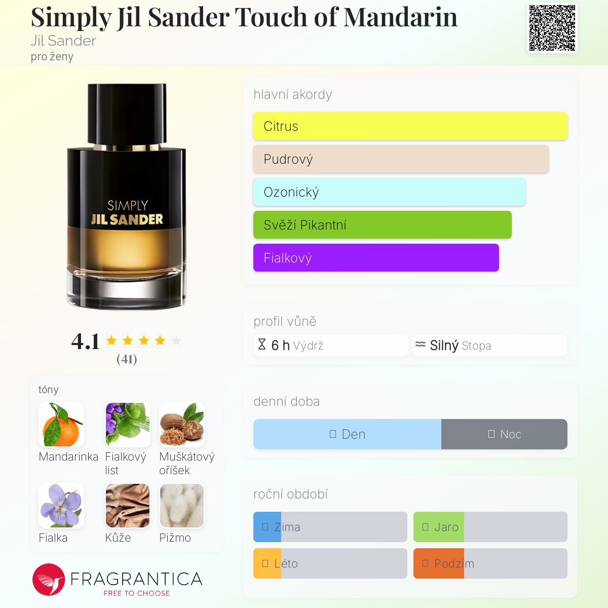 Simply Jil Sander Touch of Mandarin podle Jil Sander je Chypre Floral vůně pro ženy. Simply Jil Sander Touch of Mandarin byl/a uveden/a v roce 2016. Vrchní tóny jsou Mandarinka, Fialkový list a Bergamot; střední tóny jsouMuškátový oříšek, Fialka a Cedr ; základní tóny jsou Kůže, Pižmo a Vanilka.