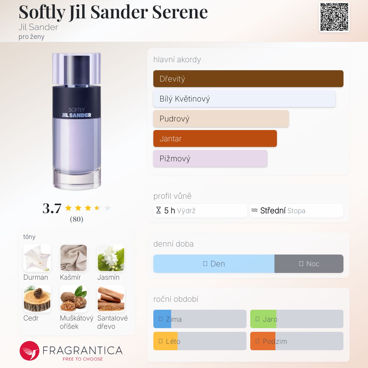 Softly Jil Sander Serene podle Jil Sander je Woody Floral Musk vůně pro ženy. Softly Jil Sander Serene byl/a uveden/a v roce 2020. Vrchní tón je Durman ; střední tóny jsouJasmín, Muškátový oříšek a Benzoin ; základní tóny jsou Kašmír, Cedr a Santalové dřevo.