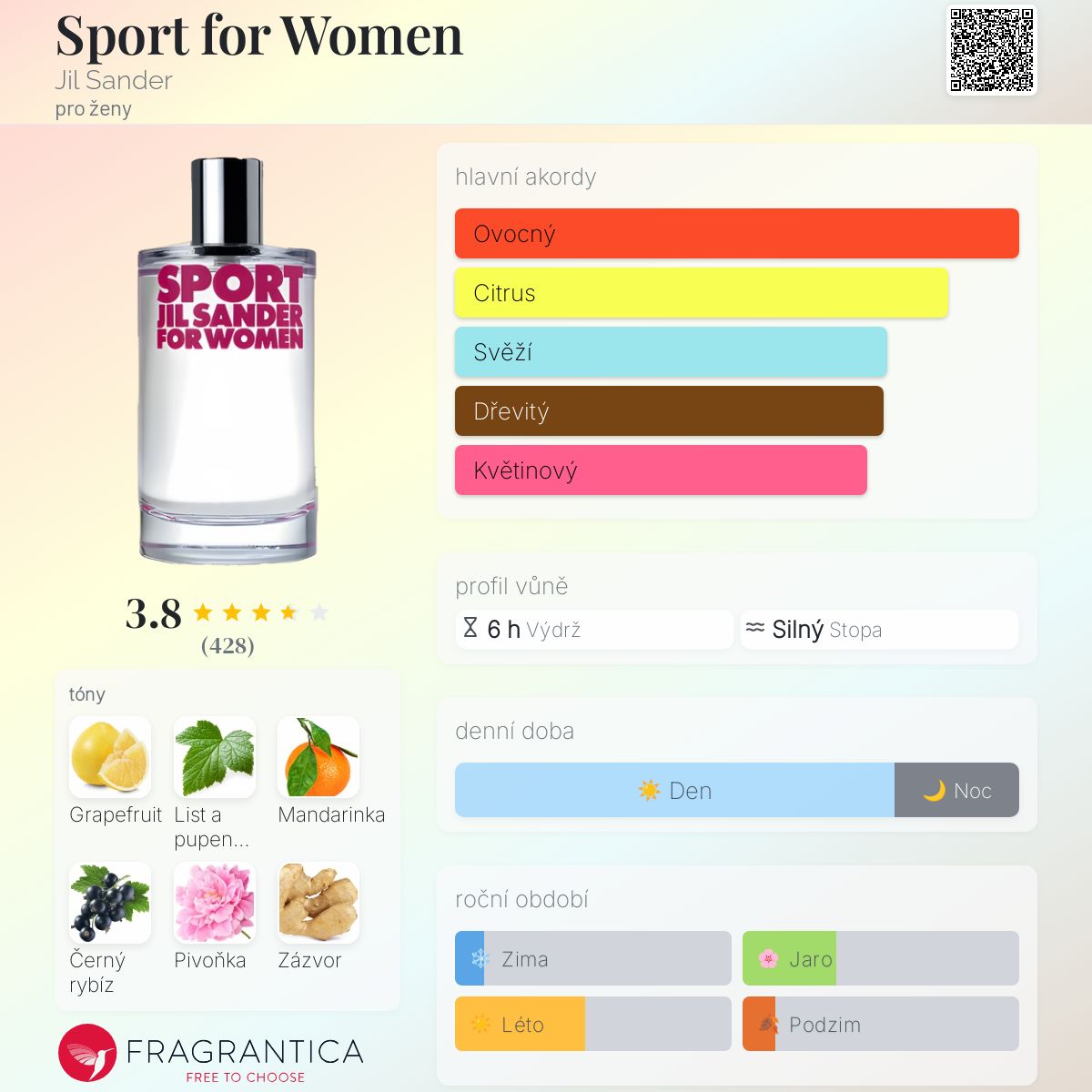 Sport for Women podle Jil Sander je Floral Fruity vůně pro ženy. Sport for Women byl/a uveden/a v roce 2005. Sport for Women byl/a vytvořen/a Beatrice Piquet a Sophie Labbe. Vrchní tóny jsou Grapefruit, Kasie, Sicilská mandarinka, Jablko a Broskev; střední tóny jsouČerný rybíz, Pivoňka a Růžová frézie ; základní tóny jsou Zázvor, Cedr, Pižmo, Santalové dřevo, Vanilka a Fazole tonka.