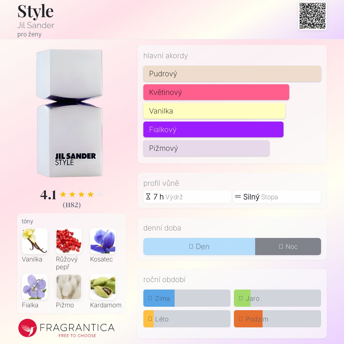 Style podle Jil Sander je Floral Woody Musk vůně pro ženy. Style byl/a uveden/a v roce 2006. "Nosem" za touto vůní je Bernard Ellena. Vrchní tóny jsou Růžový pepř, Kardamom, Mango a Frézie; střední tóny jsouKosatec, Fialka, Magnólie a Jasmín ; základní tóny jsou Vanilka, Pižmo a Jantar (ambra).