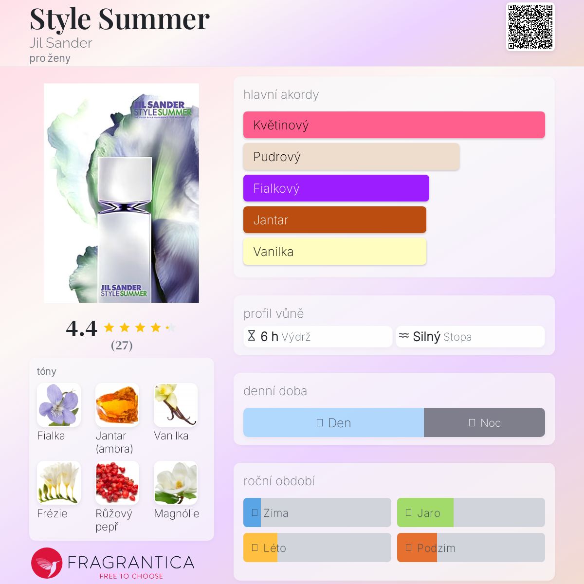 Style Summer podle Jil Sander je Floral vůně pro ženy. Style Summer byl/a uveden/a v roce 2008. Style Summer byl/a vytvořen/a Bernard Ellena a Lucas Sieuzac. Vrchní tóny jsou Frézie, Růžový pepř, Leknín a Bergamot; střední tóny jsouFialka, Magnólie a Jasmín ; základní tóny jsou Jantar (ambra), Vanilka, Vetiver a Pižmo.