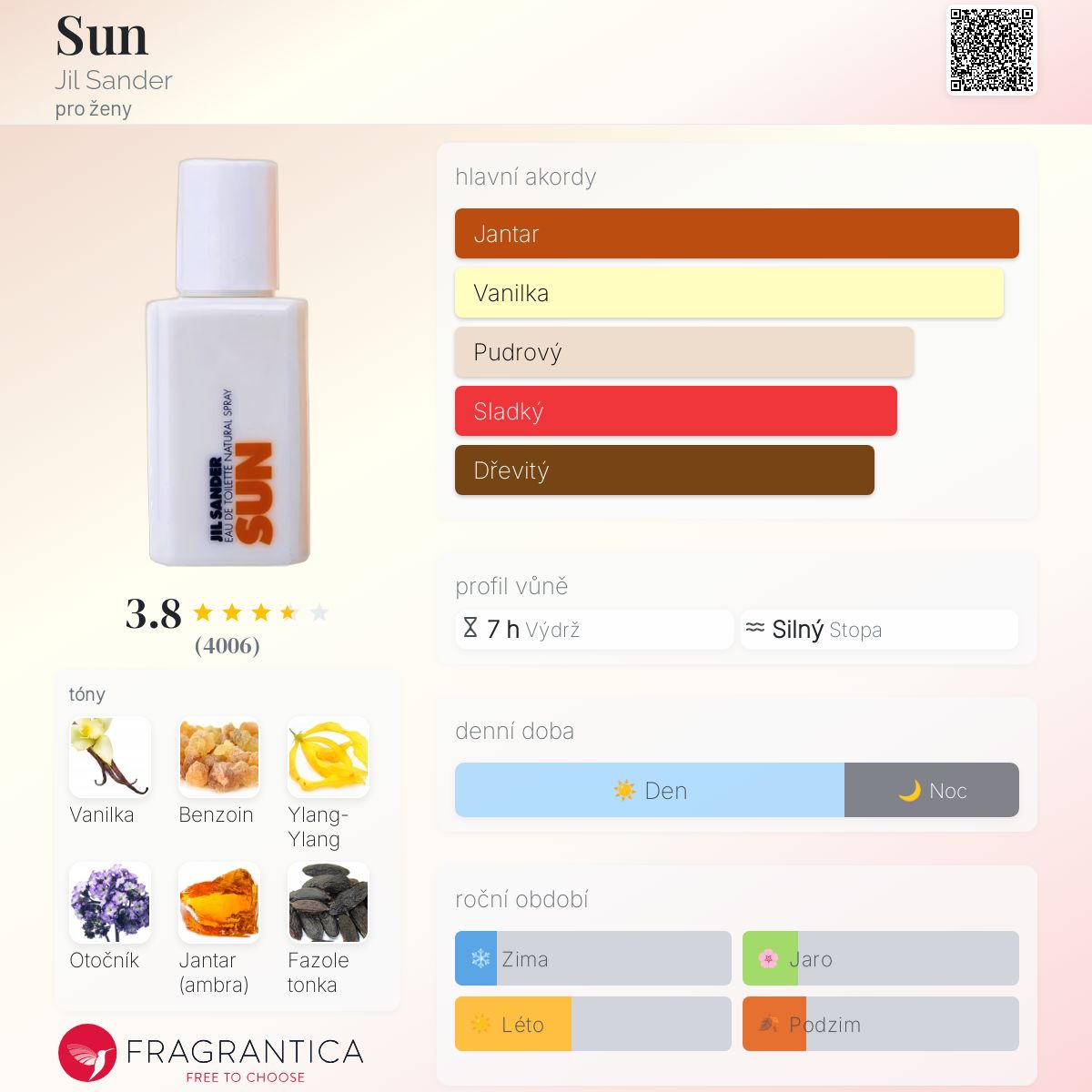 Sun podle Jil Sander je Orientální Floral vůně pro ženy. Sun byl/a uveden/a v roce 1989. "Nosem" za touto vůní je Pierre Bourdon. Vrchní tóny jsou Ovocné tóny, Květ afrického pomeranče, Palisandr, Citron amalfi , Černý rybíz a Bergamot; střední tóny jsouYlang-Ylang, Otočník, Karafiát, Kořen kosatce, Konvalinka a Růže ; základní tóny jsou Vanilka, Benzoin, Jantar (ambra), Fazole tonka, Santalové dřevo, Pižmo, Styrax, Tabákový list a Pačuli.