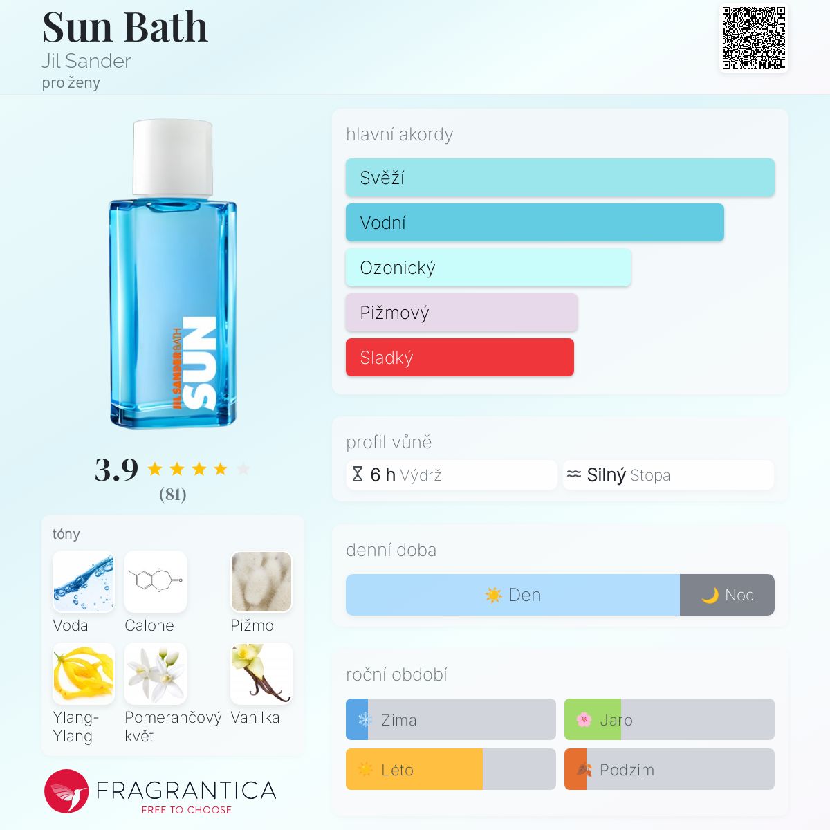 Sun Bath podle Jil Sander je Floral Aquatic vůně pro ženy. Sun Bath byl/a uveden/a v roce 2015. "Nosem" za touto vůní je Philippe Bousseton. Vrchní tóny jsou Vodní tóny, Calone, Růžový pepř a Frézie; střední tóny jsouYlang-Ylang, Pomerančový květ a Růže ; základní tóny jsou Pižmo, Vanilka a Fazole tonka.