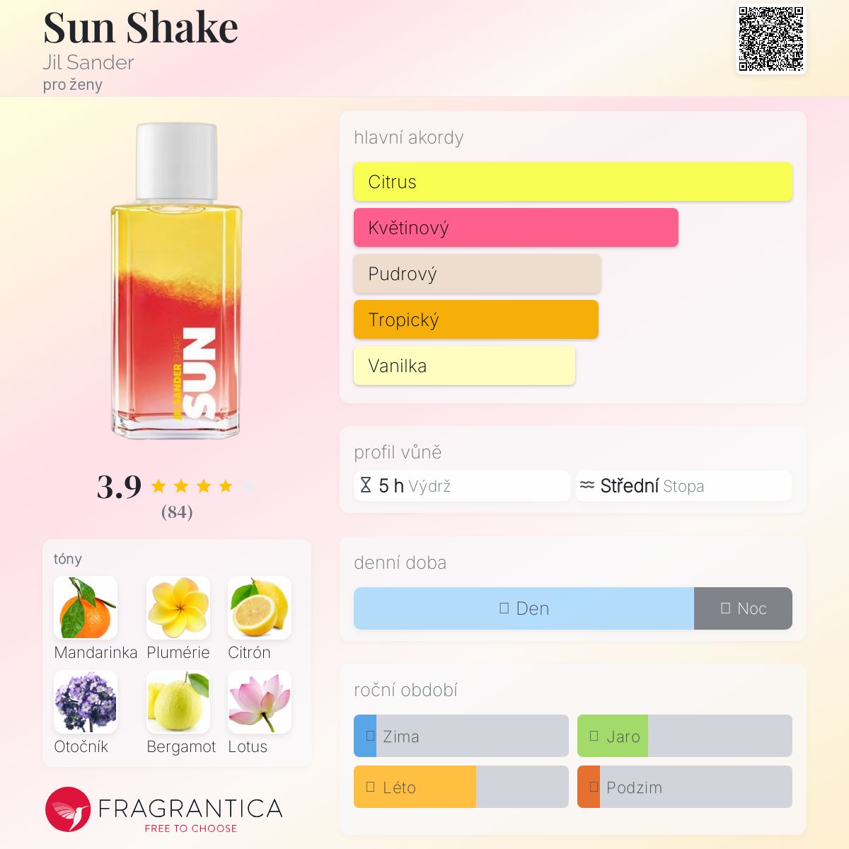 Sun Shake podle Jil Sander je Floral Fruity vůně pro ženy. Sun Shake byl/a uveden/a v roce 2016. "Nosem" za touto vůní je Nathalie Lorson. Vrchní tóny jsou Mandarinka, Citronová kůra a Bergamot; střední tóny jsouPlumérie, Lotus a Růžový grapefruit ; základní tóny jsou Otočník, Dřevité tóny a Pižmo.