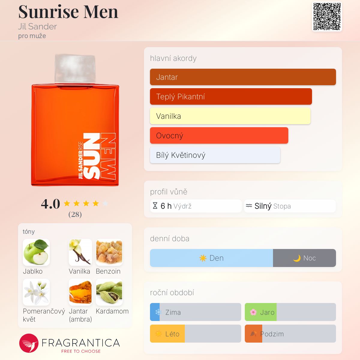 Sunrise Men podle Jil Sander je Orientální vůně pro muže. Sunrise Men byl/a uveden/a v roce 2014. Vrchní tón je Kardamom ; střední tóny jsouZelené jablko, Pomerančový květ a Jantar (ambra) ; základní tóny jsou Vanilka, Benzoin a Pačuli.