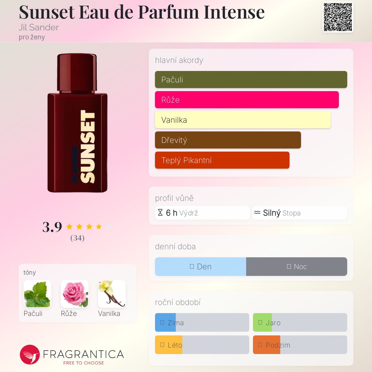Sunset Eau de Parfum Intense podle Jil Sander je Chypre Floral vůně pro ženy. Sunset Eau de Parfum Intense byl/a uveden/a v roce 2023. "Nosem" za touto vůní je Sonia Constant.