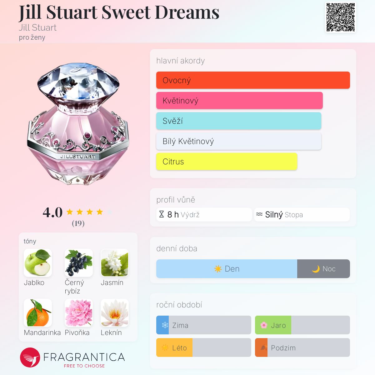 Jill Stuart Sweet Dreams podle Jill Stuart je Floral vůně pro ženy. Jill Stuart Sweet Dreams byl/a uveden/a v roce 2008. Vrchní tóny jsou Granny Smith jablko, Černý rybíz, Mandarinka, Leknín, Citron amalfi a Hruška; střední tóny jsouJasmín, Pivoňka, Květ afrického pomeranče, Konvalinka, Růže, Magnólie a Orchidej ; základní tóny jsou Pižmo, Santalové dřevo, Virginský cedr, Jantar (ambra) a Vanilka.