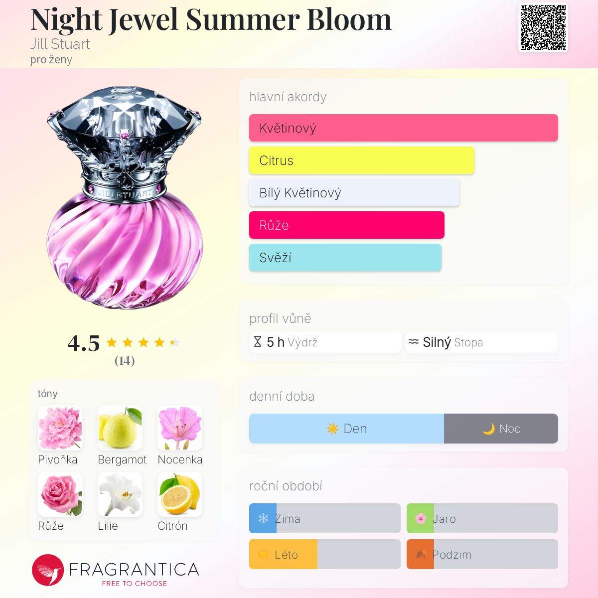Night Jewel Summer Bloom podle Jill Stuart je Floral vůně pro ženy. Night Jewel Summer Bloom byl/a uveden/a v roce 2011. Vrchní tóny jsou Bergamot, Italský citrón a Jablko; střední tóny jsouPivoňka, Nocenka, Růže, Bílá lilie, Černá růže, Tulipán, Arum lilie, Magnólie a Noční kvetoucí cereus (kaktus) ; základní tóny jsou Cedr, Pižmo, Vanilka a Jantar (ambra).