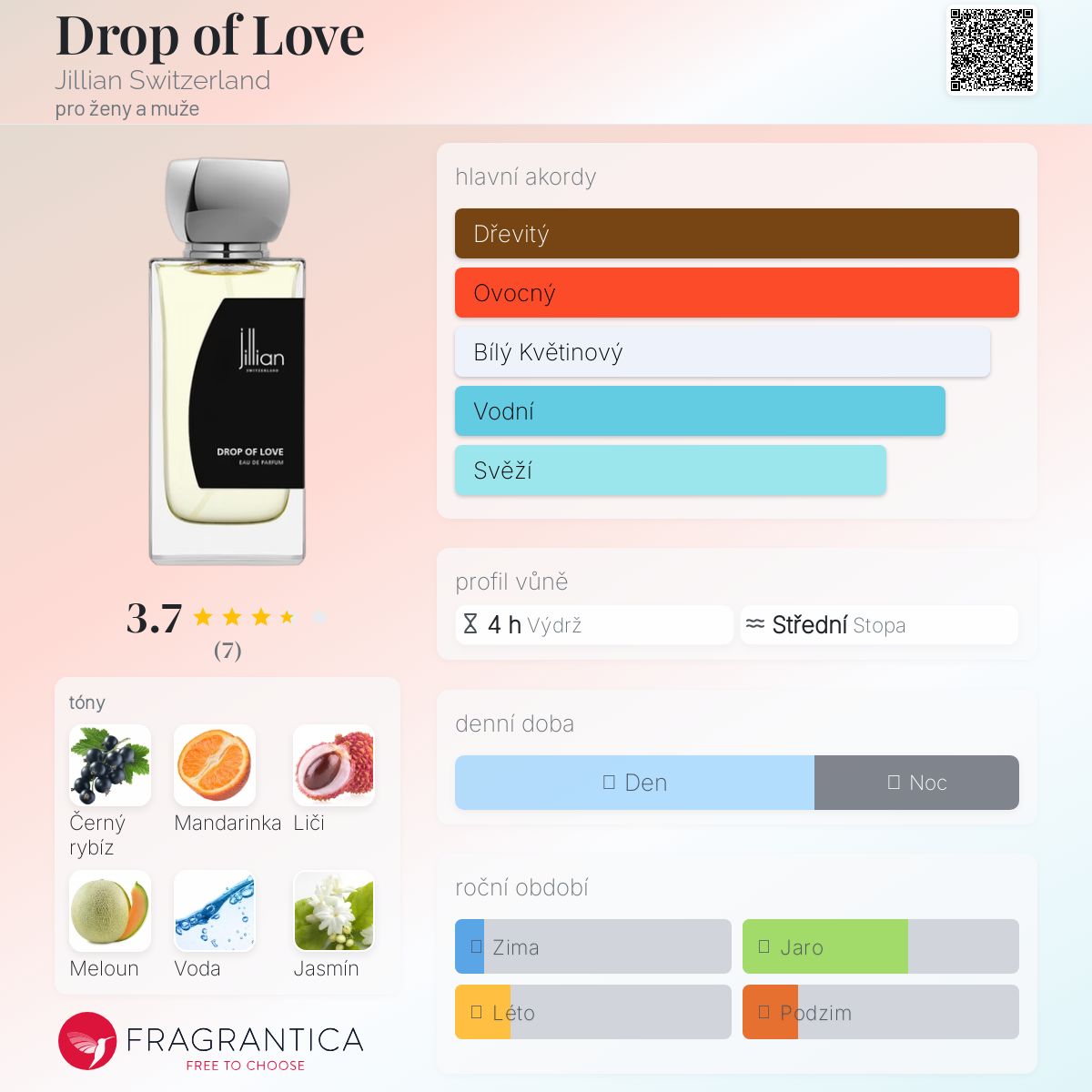 Drop of Love podle Jillian Switzerland je vůně pro ženy a muže. Drop of Love byl/a uveden/a v roce 2024. Vrchní tóny jsou Černý rybíz, Mandarinka, Liči a Meloun; střední tóny jsouVodní tóny, Jasmín, Růže a Lilie ; základní tóny jsou Santalové dřevo, Cedr, Jantar (ambra) a Pižmo.