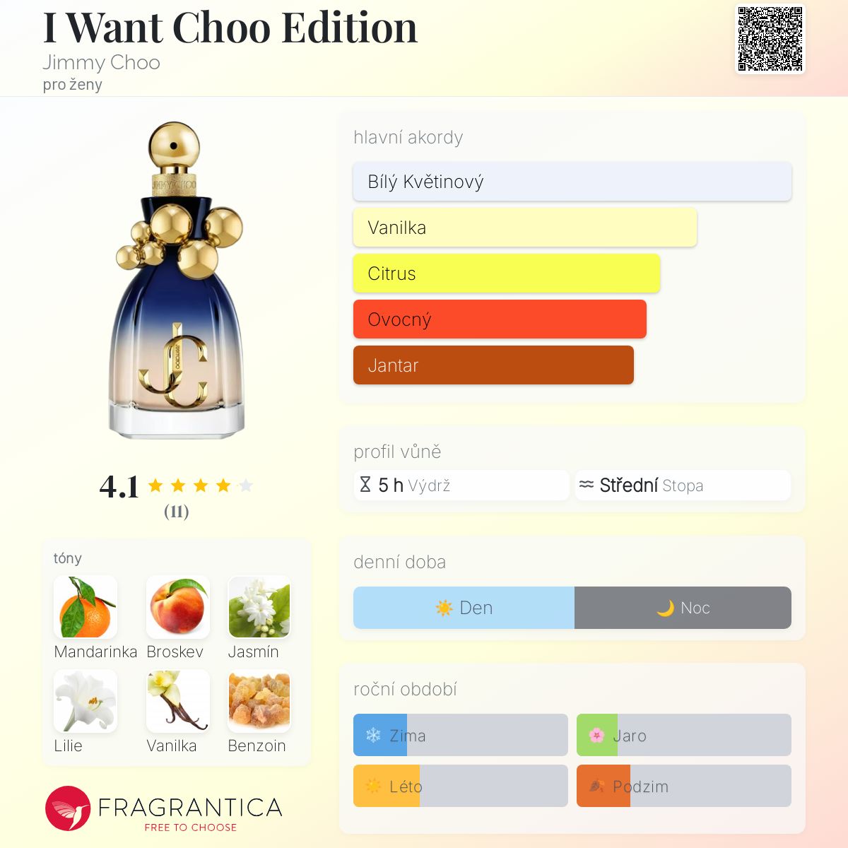 I Want Choo Edition podle Jimmy Choo je Orientální Floral vůně pro ženy. Toto je nová vůně. I Want Choo Edition byl/a uveden/a v roce 2025. Vrchní tóny jsou Mandarinka a Broskev; střední tóny jsouJasmín Sambac a Lilie ; základní tóny jsou Vanilka a Benzoin.
