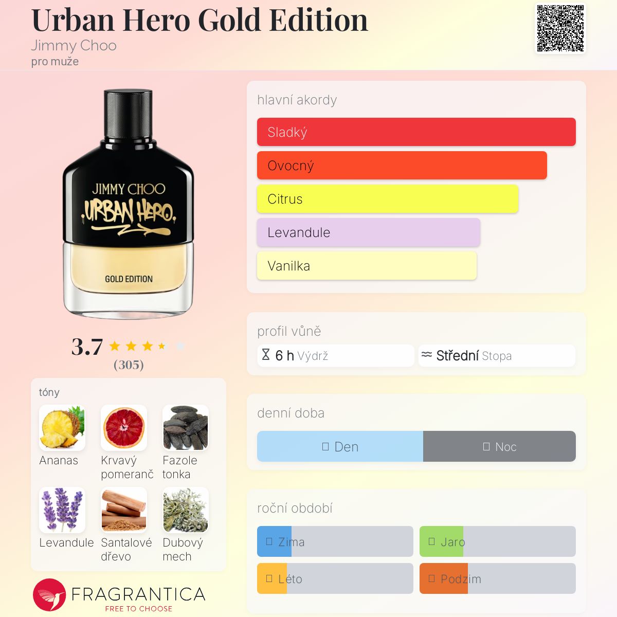 Urban Hero Gold Edition podle Jimmy Choo je Woody vůně pro muže. Urban Hero Gold Edition byl/a uveden/a v roce 2021. "Nosem" za touto vůní je Juliette Karagueuzoglou. Vrchní tóny jsou Ananas a Krvavý pomeranč; střední tóny jsouFazole tonka a Levandule ; základní tóny jsou Santalové dřevo a Dubový mech.