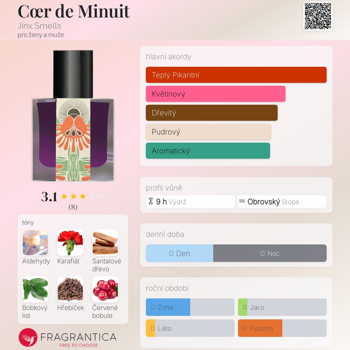 Cœr de Minuit podle Jinx Smells je Floral Aldehyde vůně pro ženy a muže. Toto je nová vůně. Cœr de Minuit byl/a uveden/a v roce 2024. "Nosem" za touto vůní je Arthur Clay Emrick. Vrchní tóny jsou Aldehydy, Bobkový list, Hřebíček, Červené bobule, Kardamom, Skořice a Zázvor; střední tóny jsouKarafiát, Damašská růže, Kadidlo, Kosatec, Jasmín, Orchidej a Fialka ; základní tóny jsou Santalové dřevo, Ambrette (přírodní pižmo), Agarové dřevo (oud), Kunzea, Pižmo a Ambra.