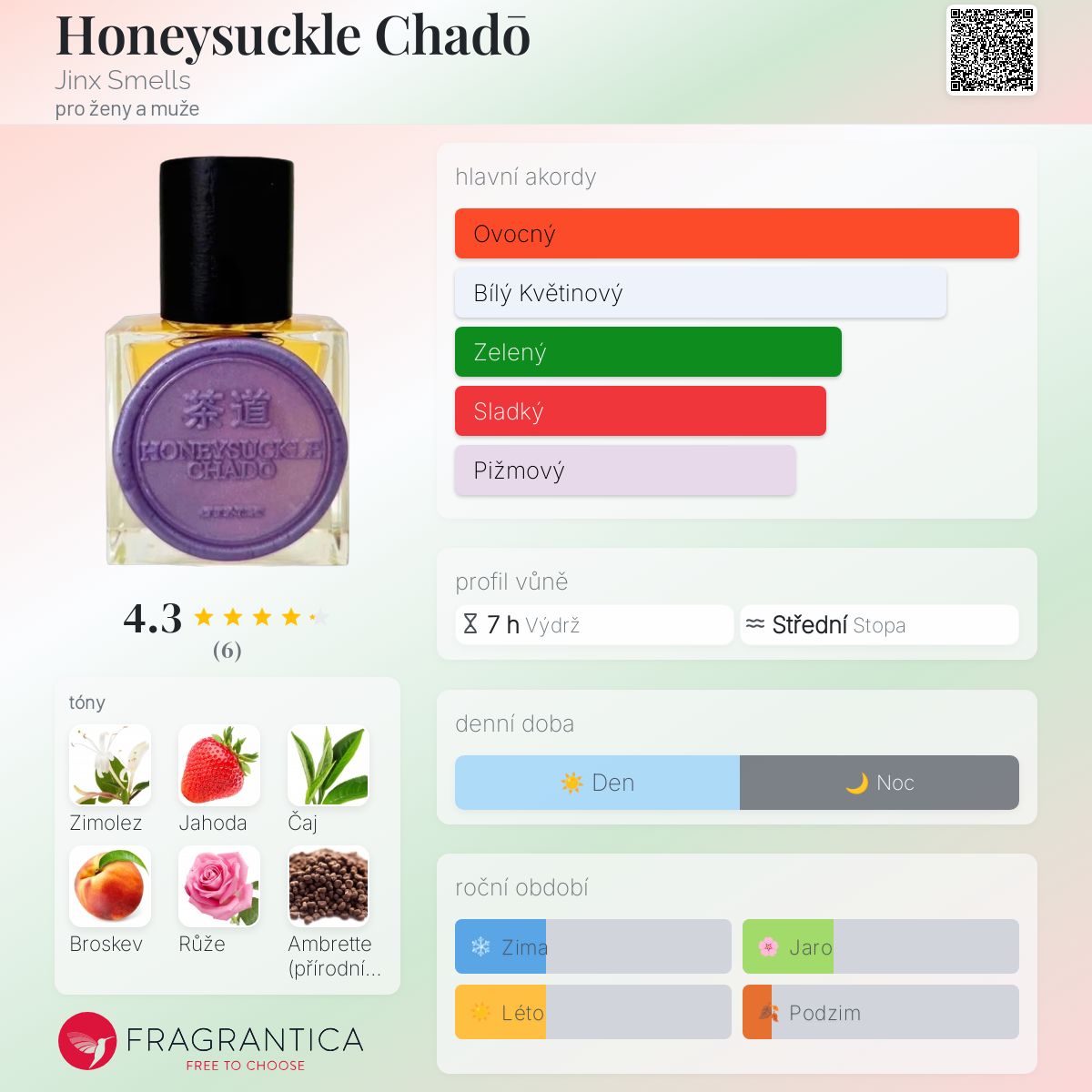 Honeysuckle Chadō podle Jinx Smells je Floral Woody Musk vůně pro ženy a muže. Toto je nová vůně. Honeysuckle Chadō byl/a uveden/a v roce 2025. "Nosem" za touto vůní je Arthur Clay Emrick. Vrchní tóny jsou Jahoda, Broskev, Citrusy a Konvalinka; střední tóny jsouZimolez, Zelený čaj, Růže, Kosatec a Seno ; základní tóny jsou Ambrette (přírodní pižmo), Agarové dřevo (oud), Pižmo a Cypriolový olej.