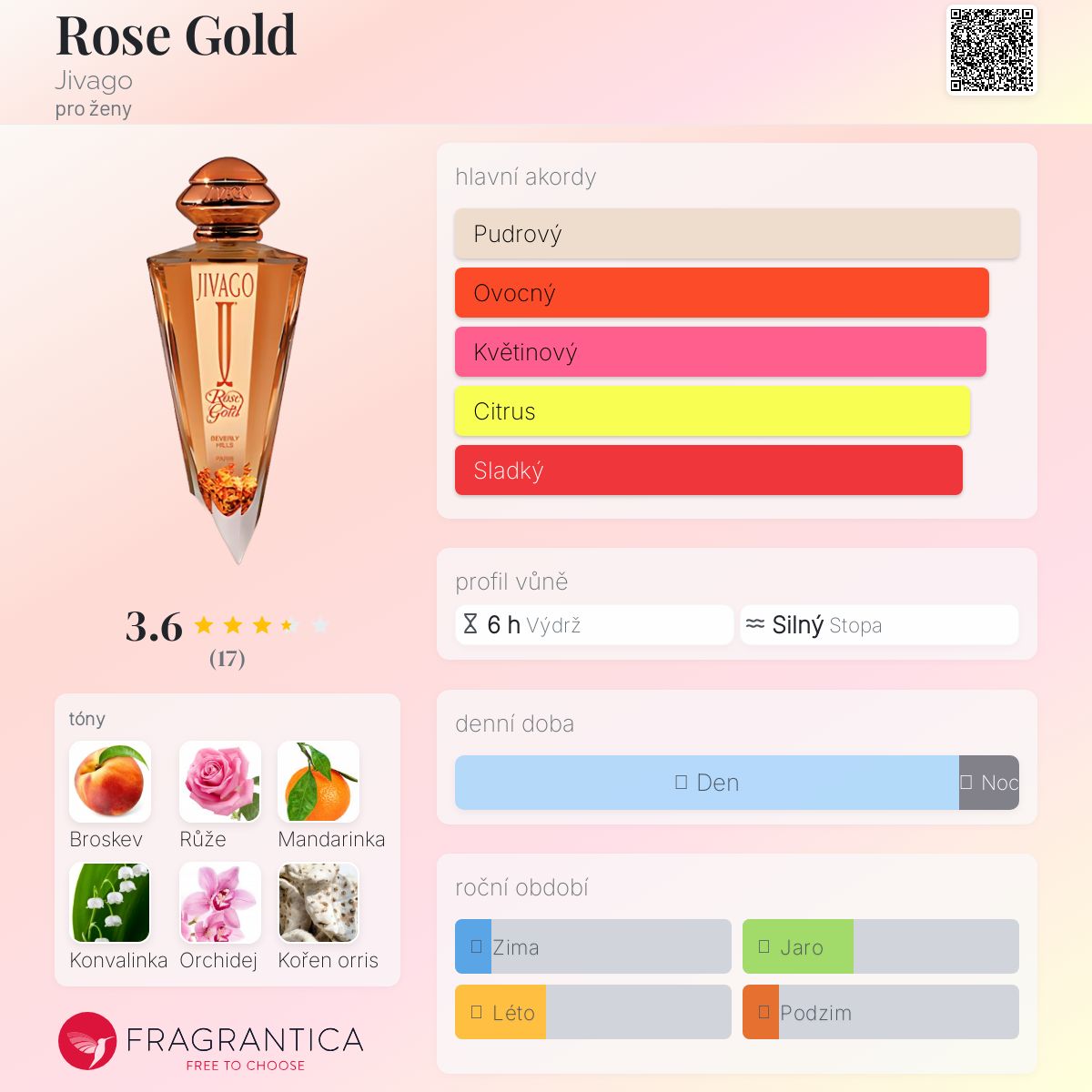 Rose Gold podle Jivago je Floral vůně pro ženy. Rose Gold byl/a uveden/a v roce 2012. Vrchní tóny jsou Broskev, Mandarinka, Citrón a Anýz; střední tóny jsouRůže, Konvalinka, Orchidej, Ylang-Ylang, Jasmín a Bílý karafiát ; základní tóny jsou Kořen orris, Pižmo, Santalové dřevo, Palisandr, Jantar (ambra), Cedr a Vanilka.