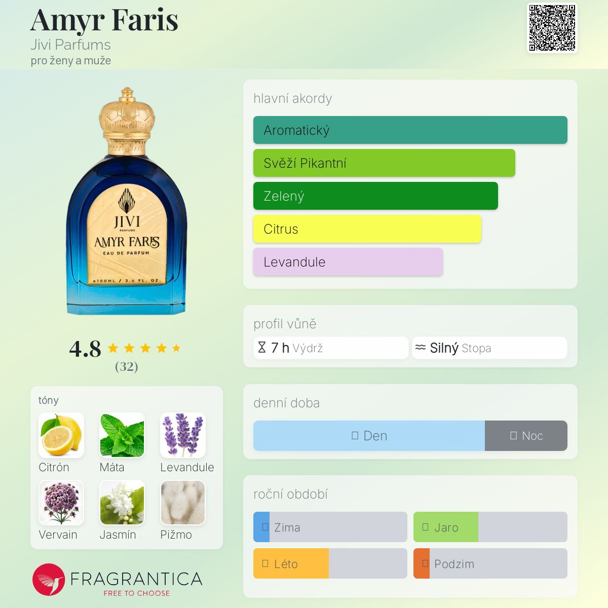 Amyr Faris podle Jivi Parfums je Citrus Aromatic vůně pro ženy a muže. Toto je nová vůně. Amyr Faris byl/a uveden/a v roce 2025. Vrchní tóny jsou Citrón, Máta a Bazalka; střední tóny jsouLevandule, Jasmín a Rozmarýn ; základní tóny jsou Vervain a Pižmo.