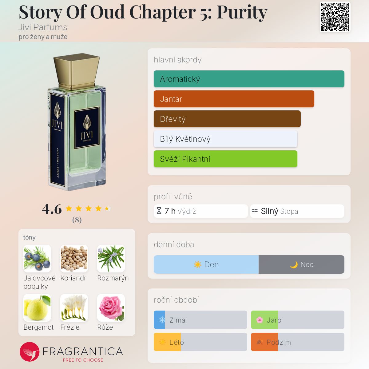 Story Of Oud Chapter 5: Purity podle Jivi Parfums je Aromatic Fougere vůně pro ženy a muže. Toto je nová vůně. Story Of Oud Chapter 5: Purity byl/a uveden/a v roce 2025. Vrchní tóny jsou Jalovcové bobulky, Koriandr, Rozmarýn a Bergamot; střední tóny jsouFrézie, Růže, Pomerančový květ a Jasmín ; základní tóny jsou Fazole tonka, Dřevité tóny, Ambra a Jantar (ambra).