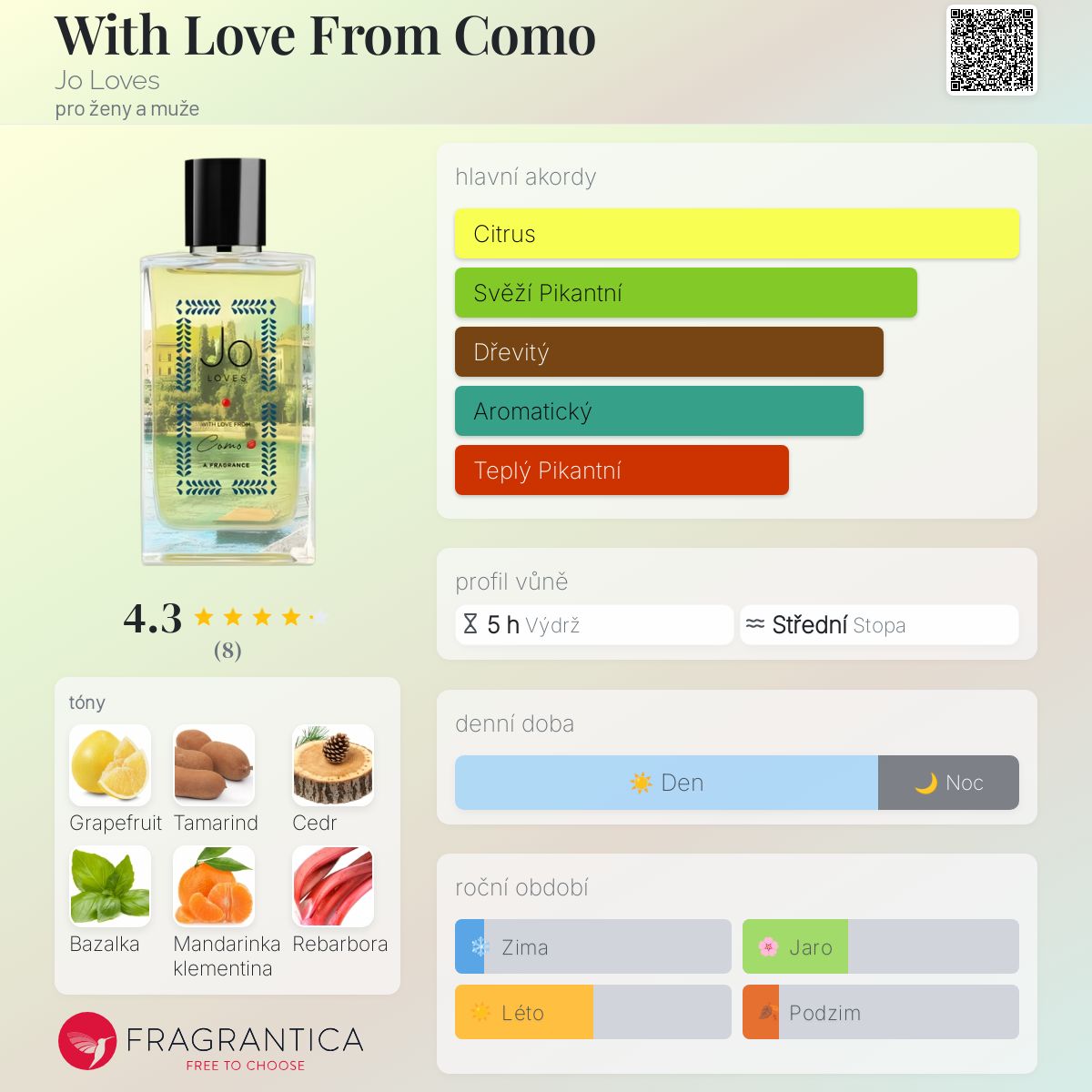 With Love From Como podle Jo Loves je vůně pro ženy a muže. Toto je nová vůně. With Love From Como byl/a uveden/a v roce 2025. "Nosem" za touto vůní je Jo Malone. Vrchní tóny jsou Grapefruit, Mandarinka klementina a Rebarbora; střední tóny jsouTamarind a Bazalka ; základní tóny jsou Cedr a Pižmo.
