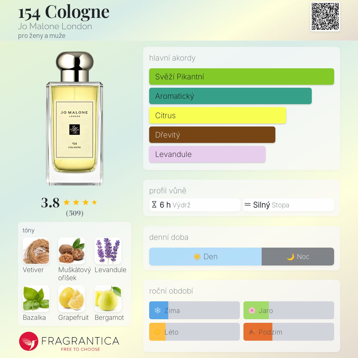 154 Cologne podle Jo Malone London je Woody Aromatic vůně pro ženy a muže. 154 Cologne byl/a uveden/a v roce 2001. "Nosem" za touto vůní je Jo Malone. Vrchní tóny jsou Grapefruit, Bergamot a Mandarinka; střední tóny jsouMuškátový oříšek, Levandule a Bazalka ; základní tóny jsou Vetiver, Pačuli, Pižmo a Vanilka.