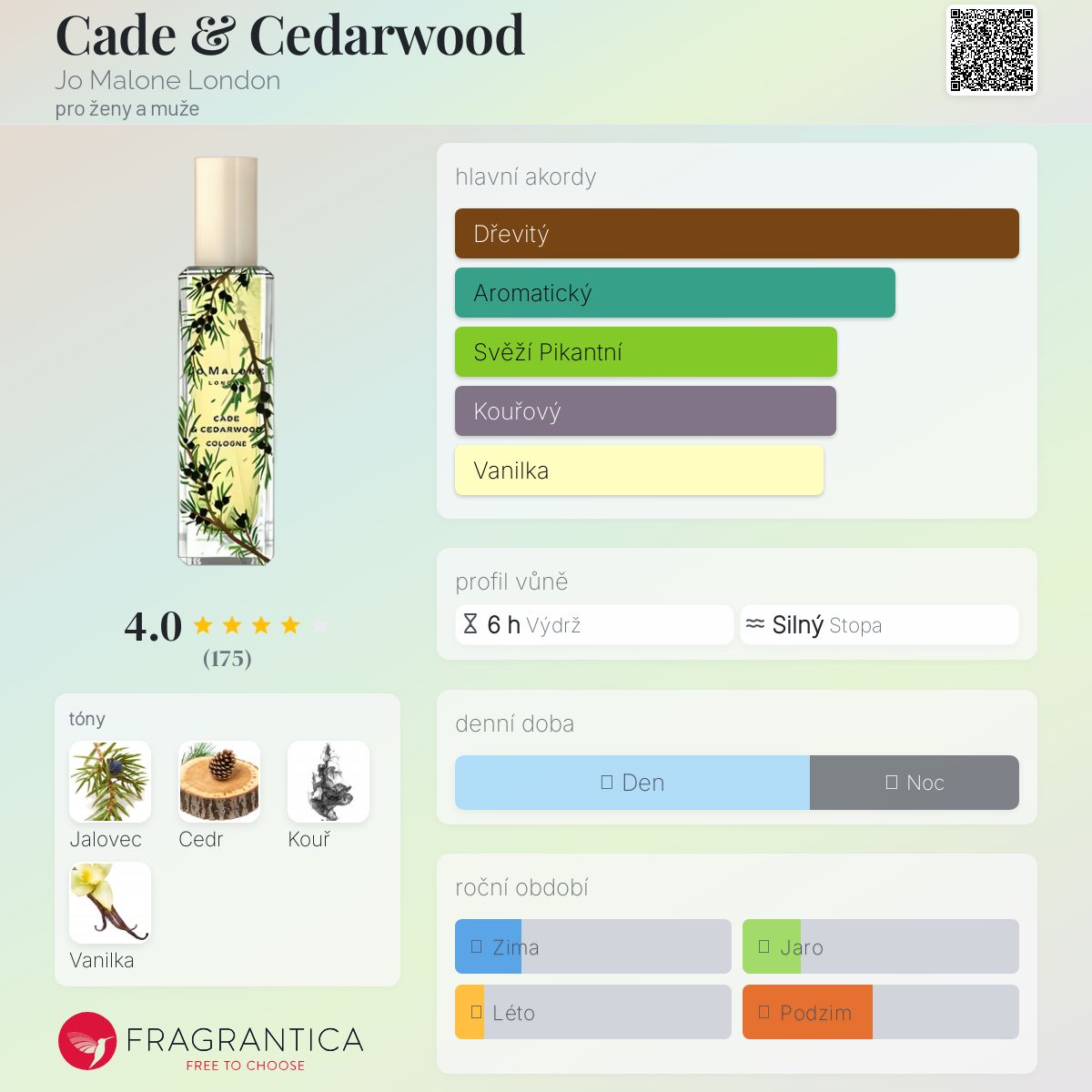 Cade & Cedarwood podle Jo Malone London je Woody Aromatic vůně pro ženy a muže. Cade & Cedarwood byl/a uveden/a v roce 2019. Cade & Cedarwood byl/a vytvořen/a Yann Vasnier a Louise Turner.