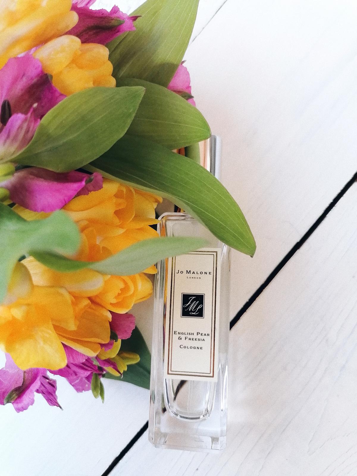 Řekla mi, že je to "English Pear & Freesia" od Jo Malone, a byla tak milá, že se mě zeptala, jestli to chci zkusit, a když jsem odpověděla, že taky ráda, otevřela kabelku, vytáhla lahvičku a nastříkala mi ji na zápěstí...