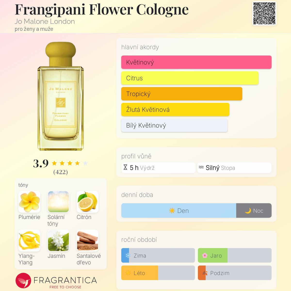 Frangipani Flower Cologne podle Jo Malone London je Floral vůně pro ženy a muže. Frangipani Flower Cologne byl/a uveden/a v roce 2019. "Nosem" za touto vůní je Marie Salamagne. Vrchní tóny jsou Solární tóny a Citrón; střední tóny jsouPlumérie, Ylang-Ylang a Jasmín ; základní tóny jsou Santalové dřevo a Benzoin.