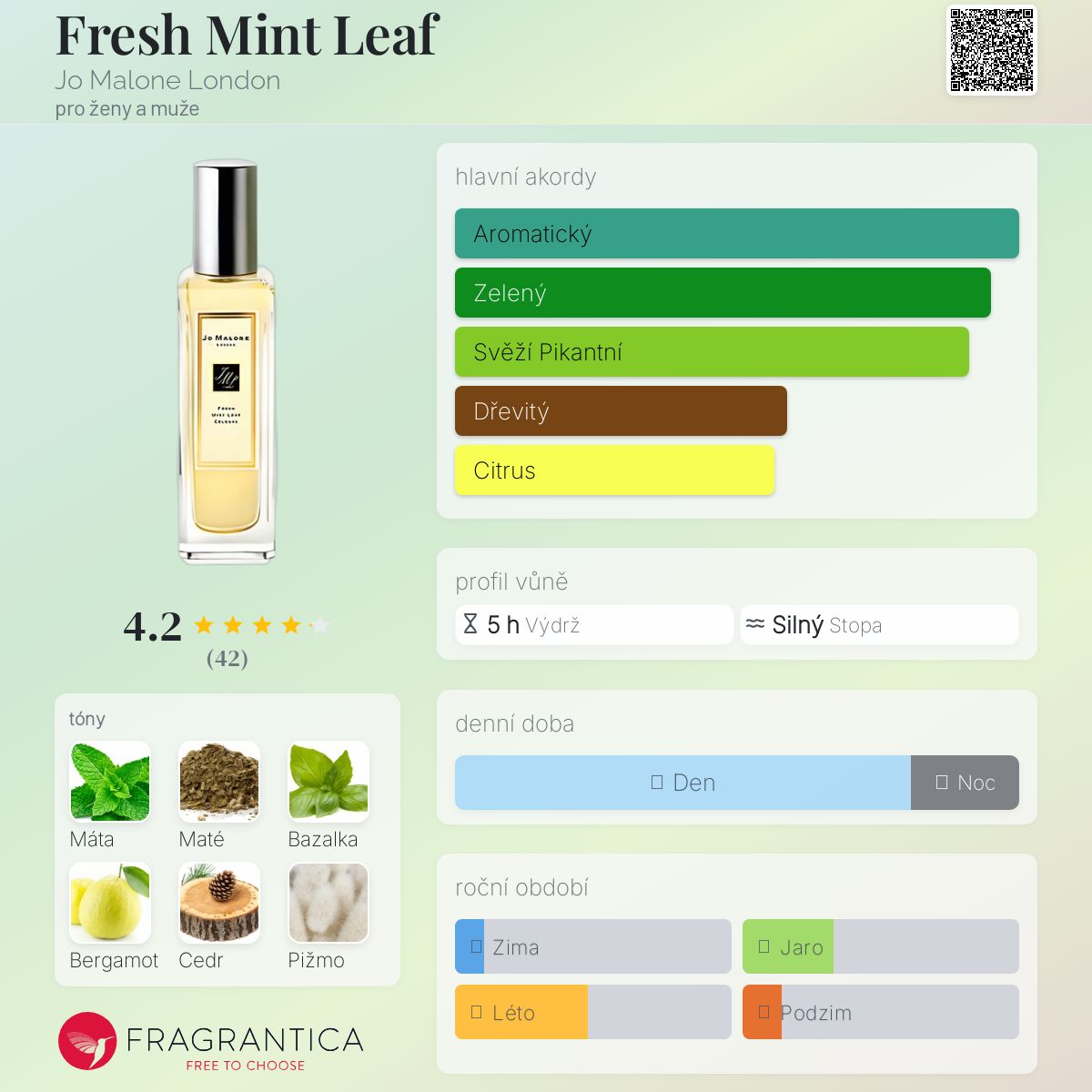 Fresh Mint Leaf podle Jo Malone London je Aromatic vůně pro ženy a muže. Fresh Mint Leaf byl/a uveden/a v roce 2011. "Nosem" za touto vůní je Christine Nagel. Vrchní tóny jsou Máta, Bazalka a Bergamot; střední tóny jsouJasmín a Rebarbora ; základní tóny jsou Cesmína, Virginský cedr a Pižmo.