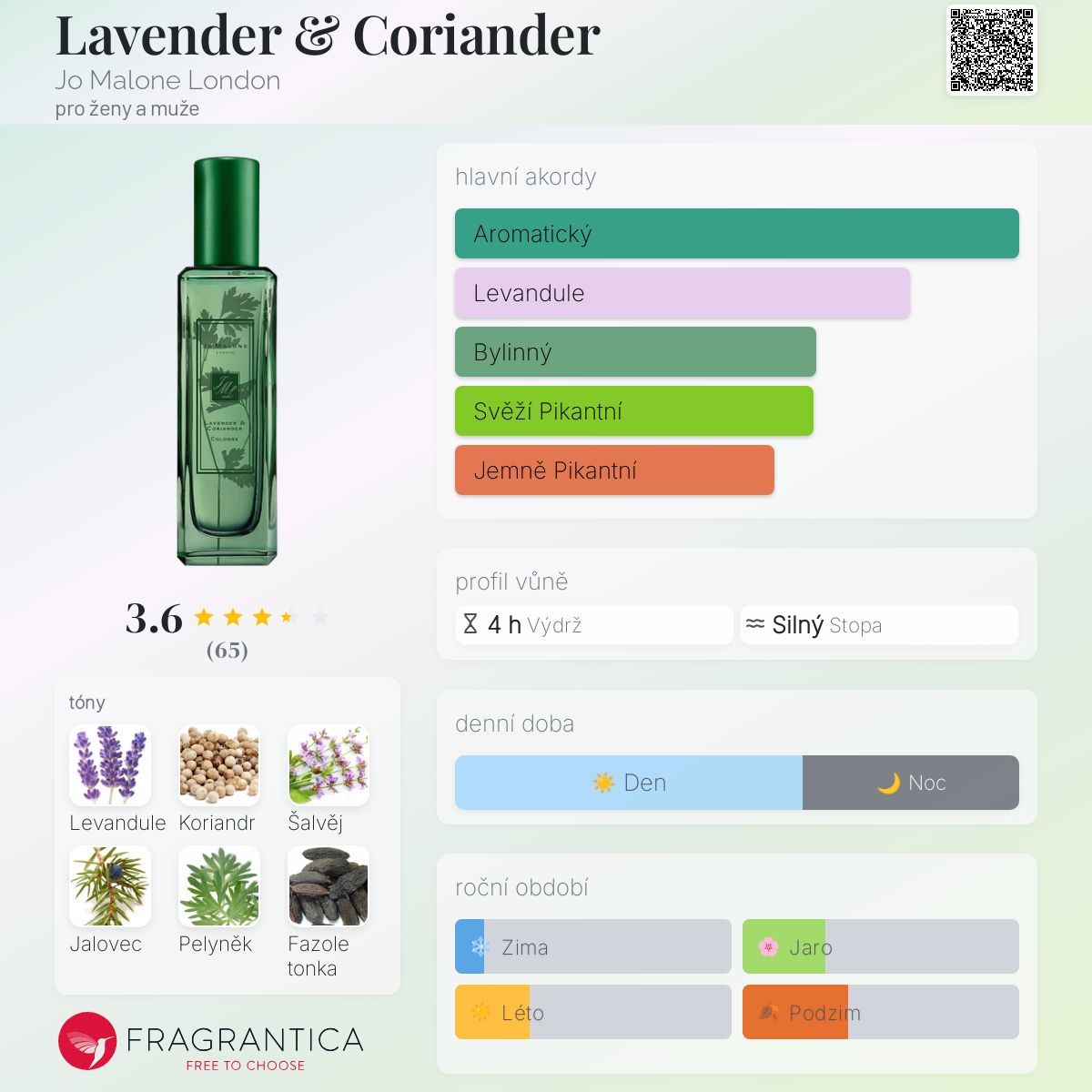 Lavender & Coriander podle Jo Malone London je Aromatic Green vůně pro ženy a muže. Lavender & Coriander byl/a uveden/a v roce 2016. "Nosem" za touto vůní je Anne Flipo. Vrchní tóny jsou Koriandr a Jalovec; střední tóny jsouLevandule a Pelyněk ; základní tóny jsou Levandule, Šalvěj a Fazole tonka.