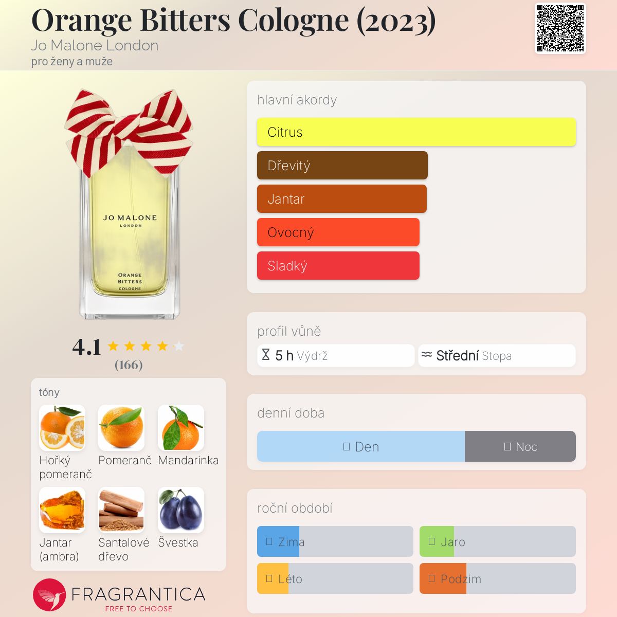 Orange Bitters Cologne (2023) podle Jo Malone London je Citrus Aromatic vůně pro ženy a muže. Orange Bitters Cologne (2023) byl/a uveden/a v roce 2023. Vrchní tóny jsou Sladký pomeranč a Mandarinka; střední tóny jsouHořký pomeranč a Sušené švestky ; základní tóny jsou Jantar (ambra) a Santalové dřevo.