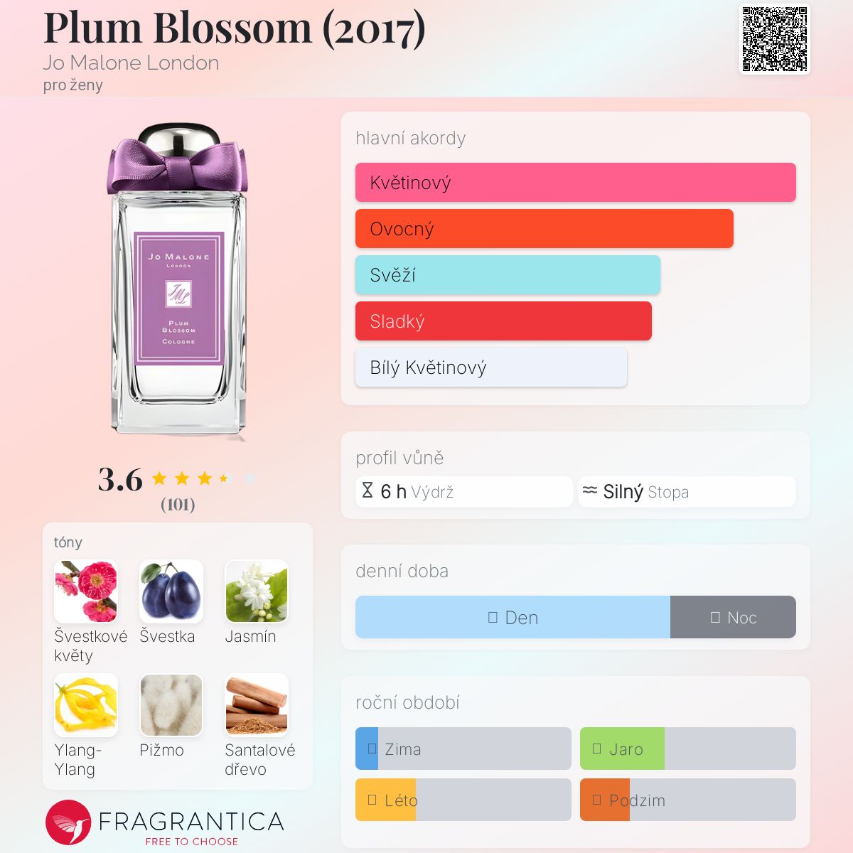 Plum Blossom (2017) podle Jo Malone London je Floral Fruity vůně pro ženy. Plum Blossom (2017) byl/a uveden/a v roce 2017. Vrchní tón je Žlutá švestka ; střední tóny jsouŠvestkové květy, Jasmín a Ylang-Ylang ; základní tóny jsou Bílé pižmo a Santalové dřevo.