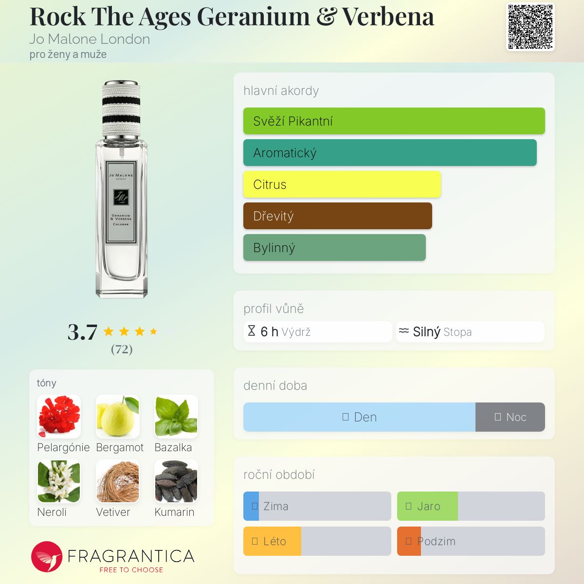 Rock The Ages Geranium & Verbena podle Jo Malone London je Aromatic Fougere vůně pro ženy a muže. Rock The Ages Geranium & Verbena byl/a uveden/a v roce 2015. "Nosem" za touto vůní je Christine Nagel. Vrchní tóny jsou Bergamot, Bazalka a Vervain; střední tóny jsouPelargónie, Neroli a Kumarin ; základní tóny jsou Vetiver, Pačuli, Cedr a Vanilka.