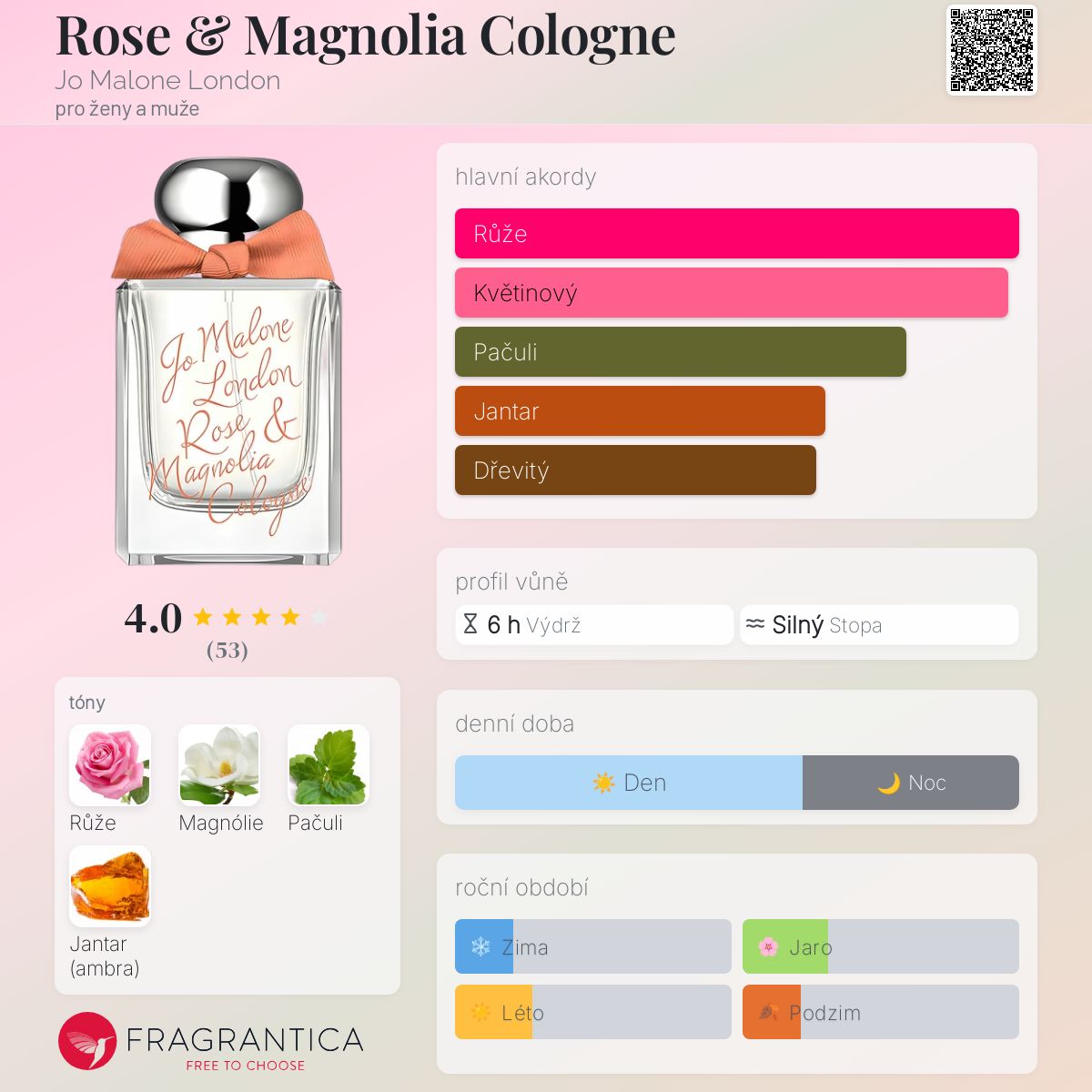 Rose & Magnolia Cologne podle Jo Malone London je Floral vůně pro ženy a muže. Rose & Magnolia Cologne byl/a uveden/a v roce 2022. Vrchní tón je Magnólie ; střední tóny jsouKvětná růže a Damašská růže ; základní tóny jsou Pačuli a Jantar (ambra).