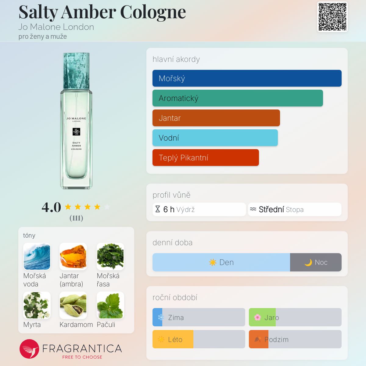 Salty Amber Cologne podle Jo Malone London je Aromatic Green vůně pro ženy a muže. Salty Amber Cologne byl/a uveden/a v roce 2022. Vrchní tón je Kardamom ; střední tóny jsouMořské tóny a Myrta ; základní tóny jsou Jantar (ambra), Mořská řasa a Pačuli.