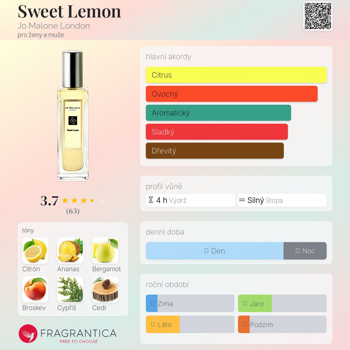 Sweet Lemon podle Jo Malone London je Aromatic Fruity vůně pro ženy a muže. Sweet Lemon byl/a uveden/a v roce 2011. "Nosem" za touto vůní je Christine Nagel. Vrchní tóny jsou Citron amalfi , Bergamot a Rebarbora; střední tóny jsouAnanas, Broskev a Frézie ; základní tóny jsou Cypřiš, Virginský cedr a Pižmo.