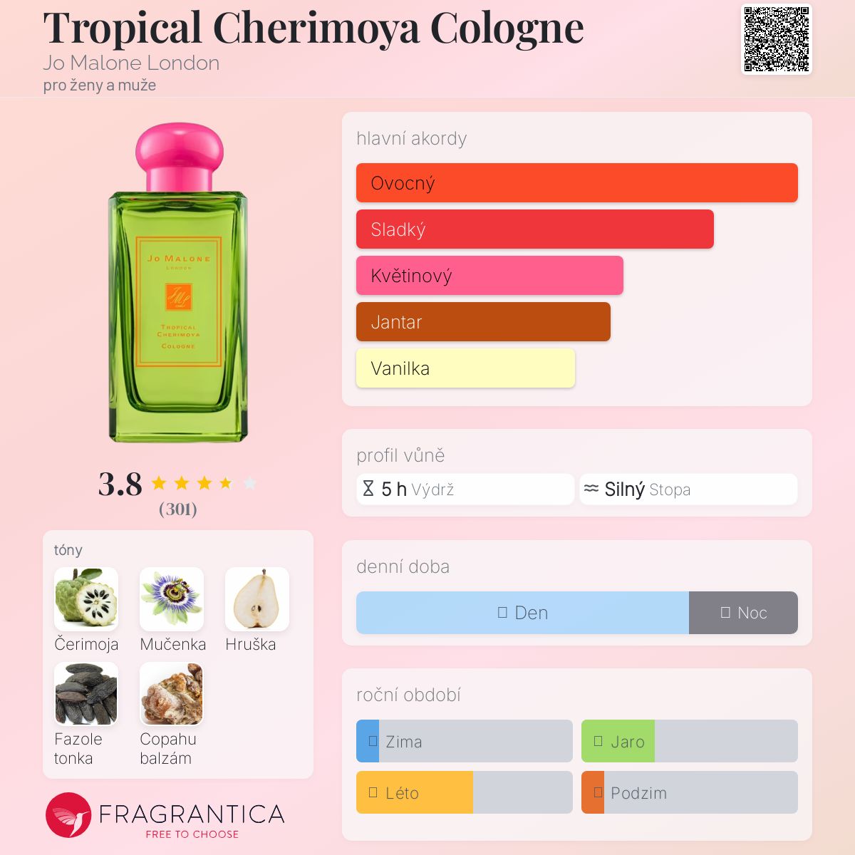 Tropical Cherimoya Cologne podle Jo Malone London je Floral Fruity vůně pro ženy a muže. Tropical Cherimoya Cologne byl/a uveden/a v roce 2018. Vrchní tóny jsou Mučenka a Hruška; střední tón jeČerimoja ; základní tóny jsou Fazole tonka a Copahu balzám.