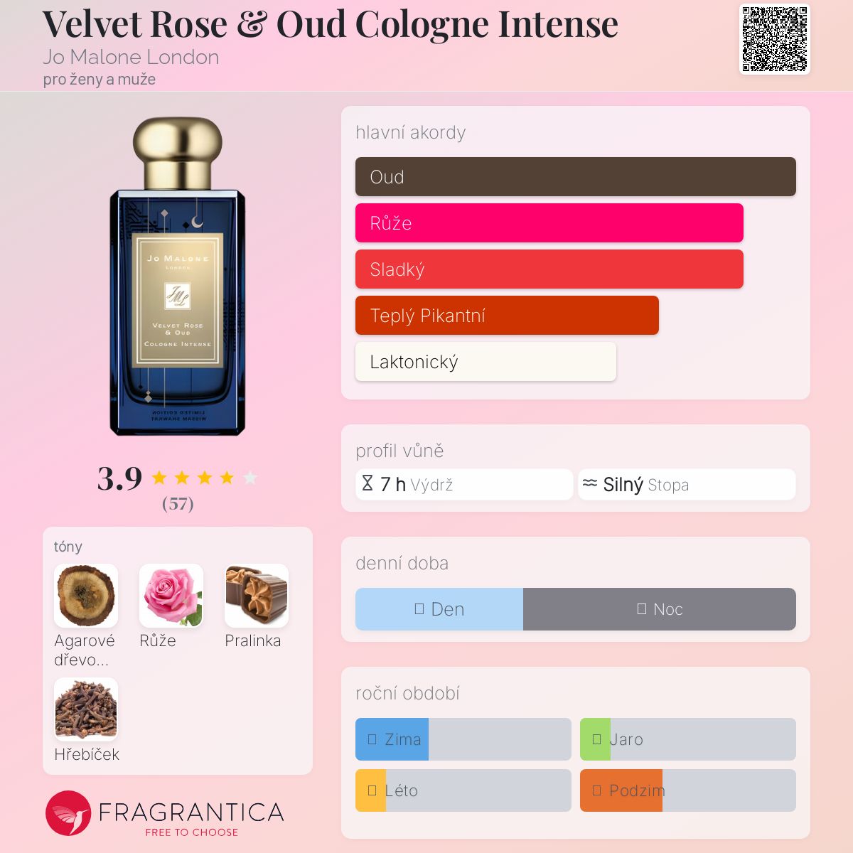 Velvet Rose & Oud Cologne Intense podle Jo Malone London je Orientální Floral vůně pro ženy a muže. Velvet Rose & Oud Cologne Intense byl/a uveden/a v roce 2019. Vrchní tón je Hřebíček ; střední tón jeDamašská růže ; základní tóny jsou Agarové dřevo (oud) a Pralinka.
