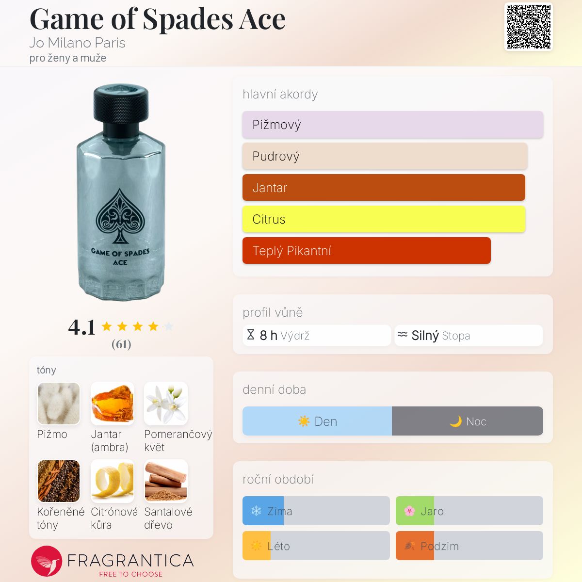Game of Spades Ace podle Jo Milano Paris je vůně pro ženy a muže. Game of Spades Ace byl/a uveden/a v roce 2021. Vrchní tóny jsou Pomerančový květ a Citrónová kůra; střední tón jeKoření ; základní tóny jsou Pižmo, Jantar (ambra) a Santalové dřevo.
