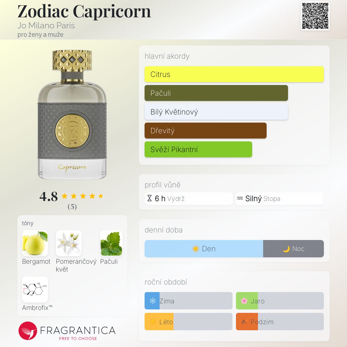 Zodiac Capricorn podle Jo Milano Paris je Orientální Woody vůně pro ženy a muže. Vrchní tóny jsou Kalábrijský bergamot a Bergamot; střední tón jeTuniský pomerančový květ ; základní tóny jsou Pačuli a Ambrofix™.