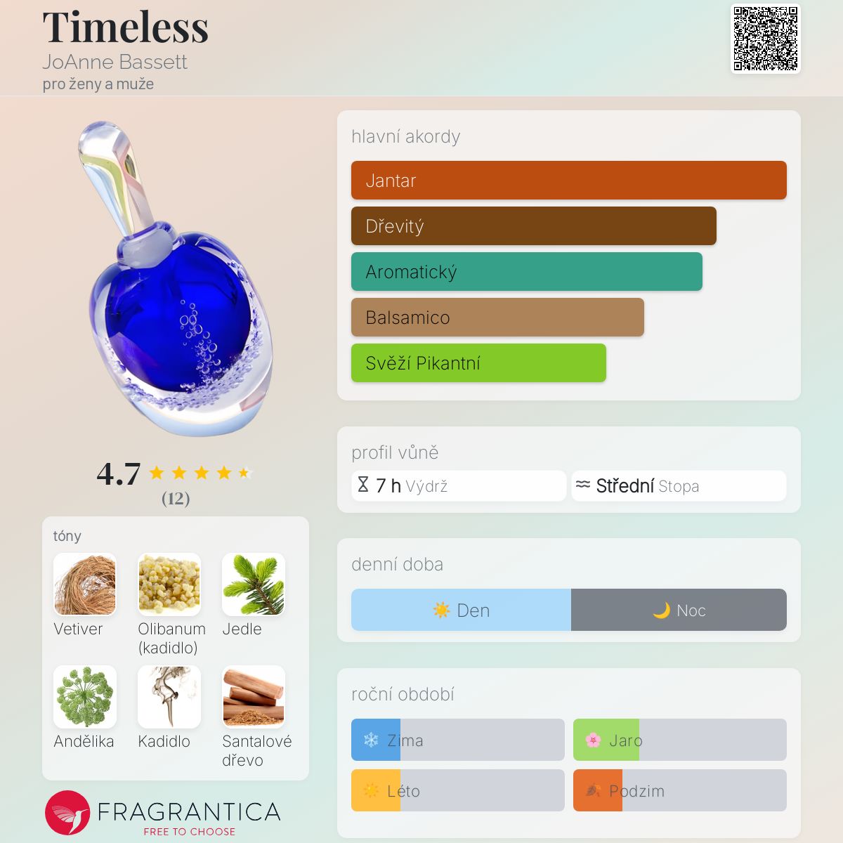 Timeless podle JoAnne Bassett je Orientální Woody vůně pro ženy a muže. Timeless byl/a uveden/a v roce 2011. "Nosem" za touto vůní je JoAnne Bassett.