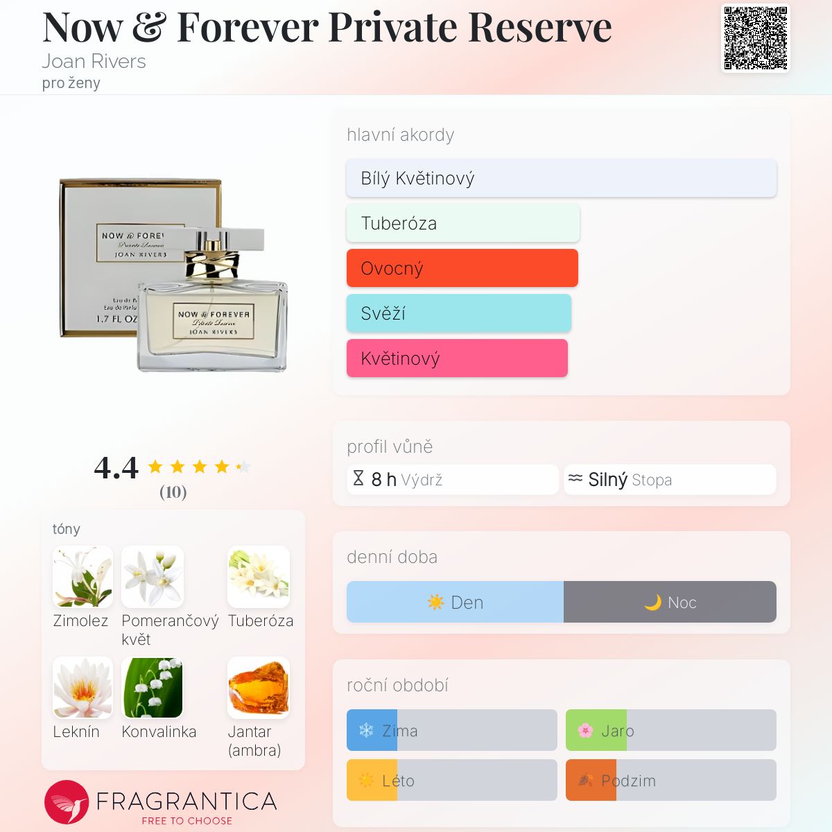 Now & Forever Private Reserve podle Joan Rivers je Floral vůně pro ženy. Now & Forever Private Reserve byl/a uveden/a v roce 2013. Vrchní tóny jsou Pomerančový květ, Ananas a Broskev; střední tóny jsouZimolez, Tuberóza, Leknín a Konvalinka ; základní tóny jsou Jantar (ambra), Santalové dřevo a Bílé pižmo.