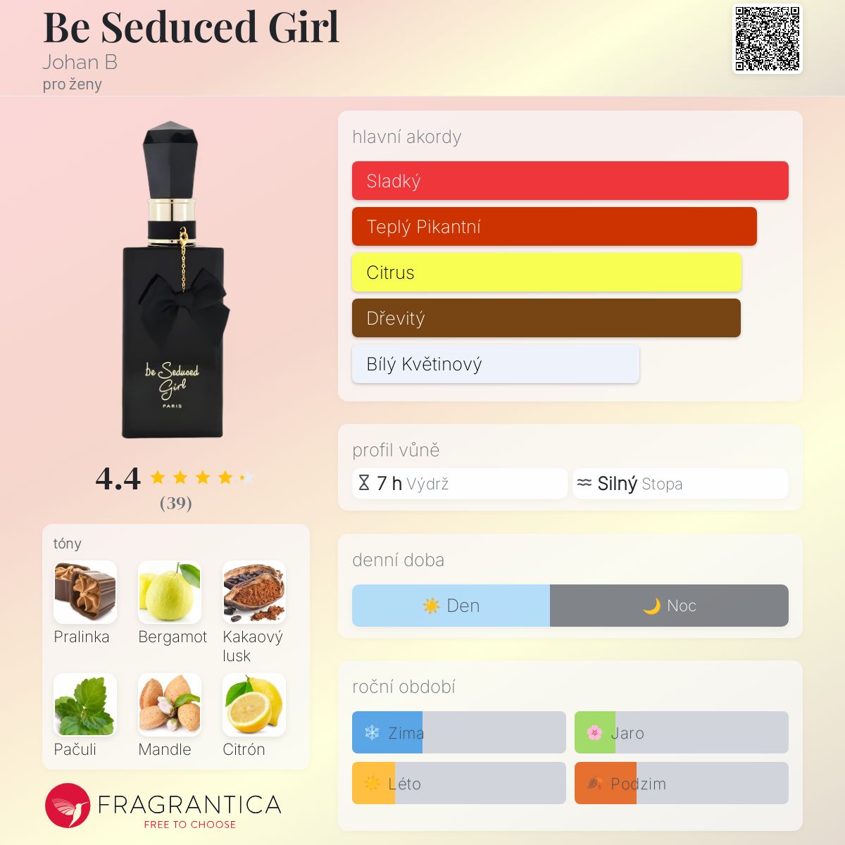 Be Seduced Girl podle Johan B je Orientální Floral vůně pro ženy. Be Seduced Girl byl/a uveden/a v roce 2020. Vrchní tóny jsou Bergamot, Mandle, Citrón a Káva; střední tóny jsouRůže, Jasmín, Pomerančový květ, Tuberóza a Kosatec ; základní tóny jsou Pralinka, Kakao, Pačuli, Fazole tonka, Santalové dřevo, Skořice, Cedr, Vanilka, Jantar (ambra) a Pižmo.