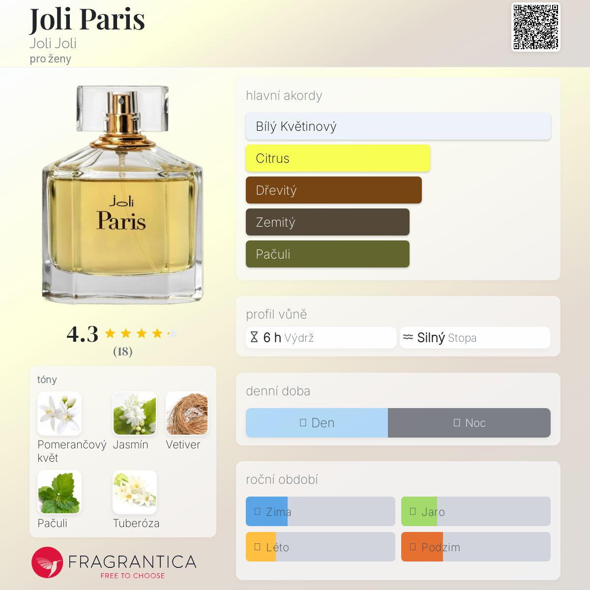 Joli Paris podle Joli Joli je Floral vůně pro ženy. Joli Paris byl/a uveden/a v roce 2022. Vrchní tón je Pomerančový květ ; střední tóny jsouJasmín a Tuberóza ; základní tóny jsou Vetiver a Pačuli.