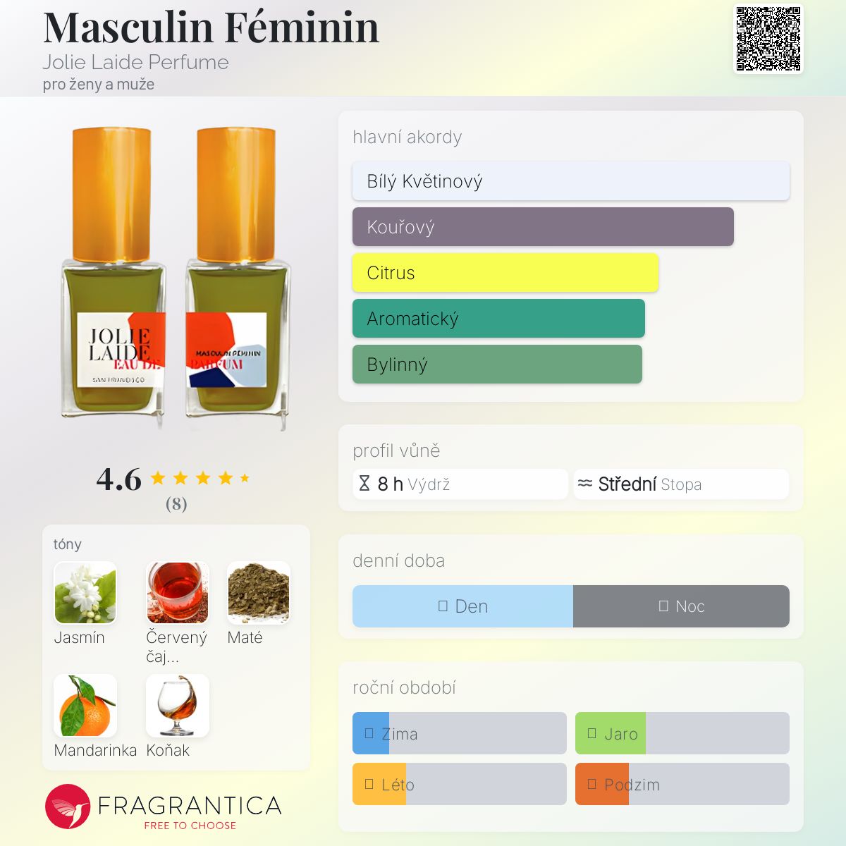 Masculin Féminin podle Jolie Laide Perfume je Orientální Floral vůně pro ženy a muže. Masculin Féminin byl/a uveden/a v roce 2013. "Nosem" za touto vůní je Heather Kaufman.