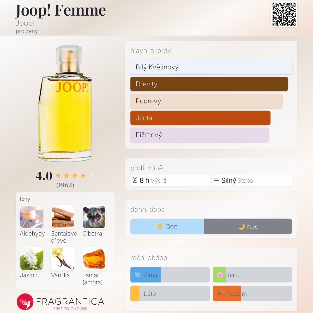 Joop! Femme podle Joop! je Orientální Woody vůně pro ženy. Joop! Femme byl/a uveden/a v roce 1987. "Nosem" za touto vůní je Michel Almairac. Vrchní tóny jsou Aldehydy, Koriandr, Ovocné tóny, Bergamot a Citrón; střední tóny jsouJasmín, Pomerančový květ, Růže a Konvalinka ; základní tóny jsou Santalové dřevo, Cibetka, Vanilka, Jantar (ambra), Fazole tonka, Pižmo, Pačuli, Dubový mech a Cedr.