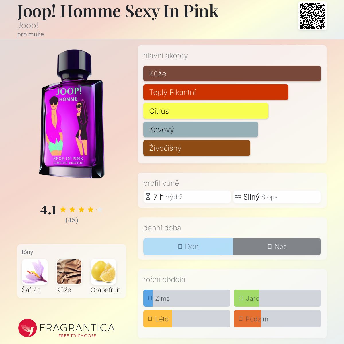 Joop! Homme Sexy In Pink podle Joop! je Leather vůně pro muže. Joop! Homme Sexy In Pink byl/a uveden/a v roce 2011. Vrchní tón je Grapefruit ; střední tón jeŠafrán ; základní tón je Kůže.