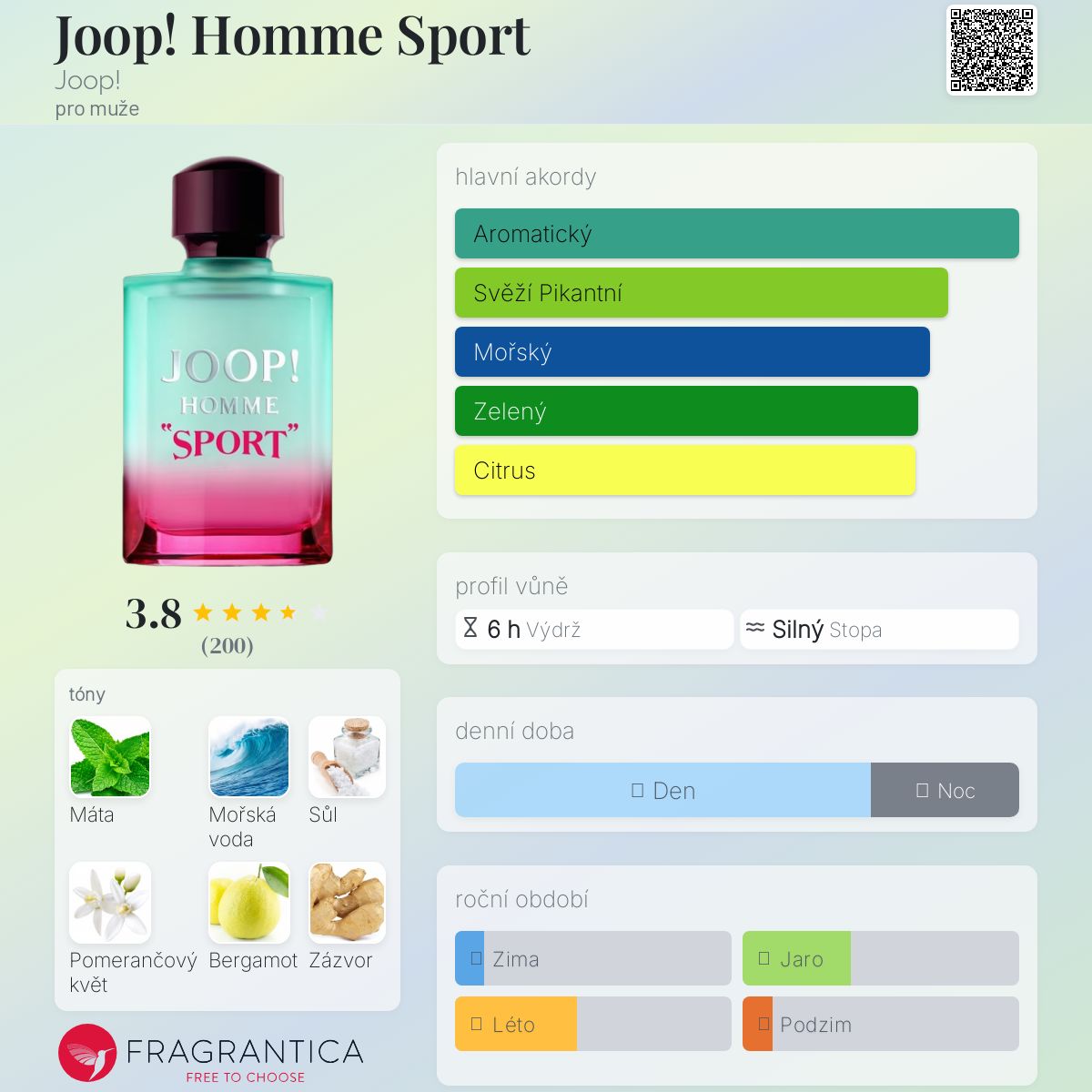 Joop! Homme Sport podle Joop! je Aromatic Aquatic vůně pro muže. Joop! Homme Sport byl/a uveden/a v roce 2016. "Nosem" za touto vůní je Antoine Lie. Vrchní tóny jsou Máta, Bergamot a Zázvor; střední tóny jsouMořské tóny, Mořská sůl, Pomerančový květ a Kůže ; základní tón je Fazole tonka.