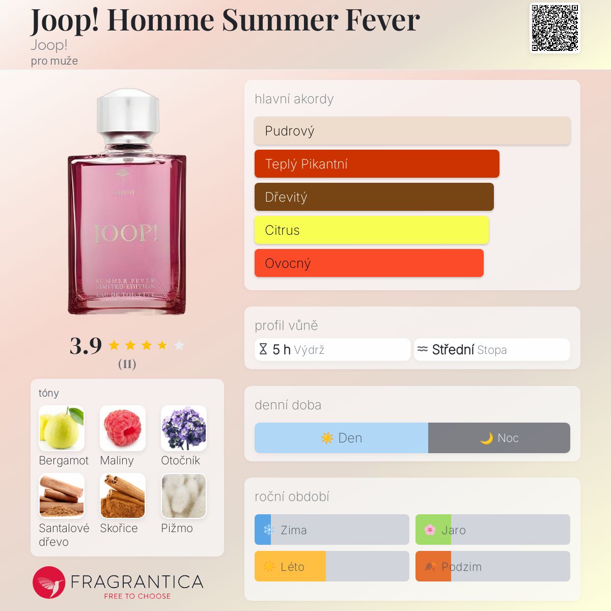 Joop! Homme Summer Fever podle Joop! je Orientální vůně pro muže. Joop! Homme Summer Fever byl/a uveden/a v roce 2004. Vrchní tóny jsou Bergamot a Maliny; střední tóny jsouOtočník a Skořice ; základní tóny jsou Santalové dřevo a Pižmo.