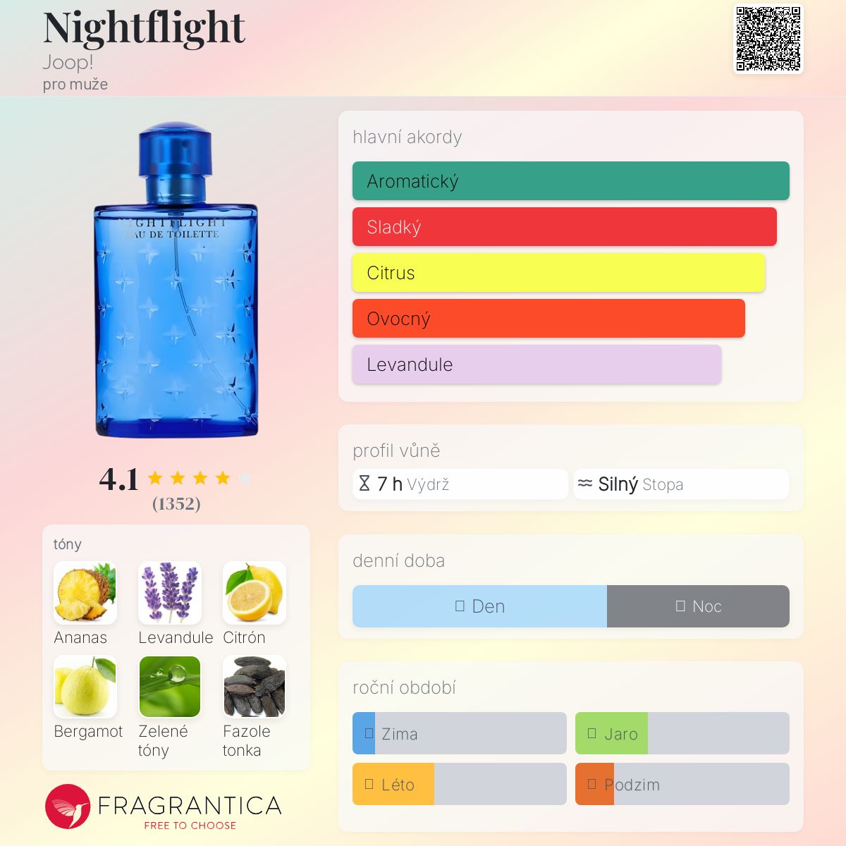 Nightflight podle Joop! je Orientální vůně pro muže. Nightflight byl/a uveden/a v roce 1992. Vrchní tóny jsou Ananas, Levandule, Citrón, Bergamot, Zelené tóny, Jalovec a Limetka; střední tóny jsouJasmín, Konvalinka, Brazilské růžové dřevo, Pelargónie, Růže a Svízel ; základní tóny jsou Fazole tonka, Mandle, Pižmo, Santalové dřevo a Jantar (ambra).