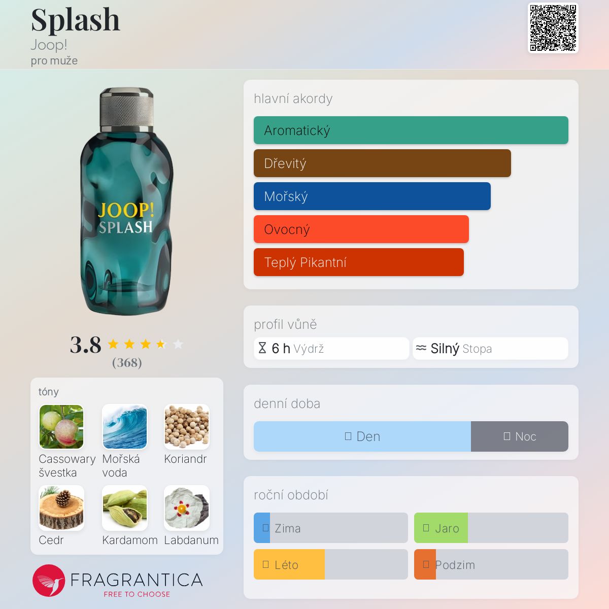 Splash podle Joop! je Woody Aquatic vůně pro muže. Splash byl/a uveden/a v roce 2011. "Nosem" za touto vůní je Louise Turner. Vrchní tóny jsou Cassowary švestka a Koriandr; střední tóny jsouMořská voda a Kardamom ; základní tóny jsou Cedr, Labdanum a Santalové dřevo.