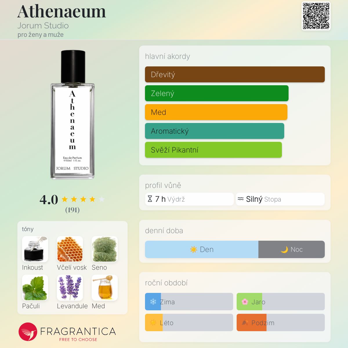 Athenaeum podle Jorum Studio je vůně pro ženy a muže. Athenaeum byl/a uveden/a v roce 2020. "Nosem" za touto vůní je Euan McCall. Vrchní tóny jsou Včelí vosk, Levandule, Med, Fenykl a Jablko; střední tóny jsouSeno, Neroli a Hyacint ; základní tóny jsou Inkoust, Pačuli, Gurjanský balzám, Kůže a Dub.